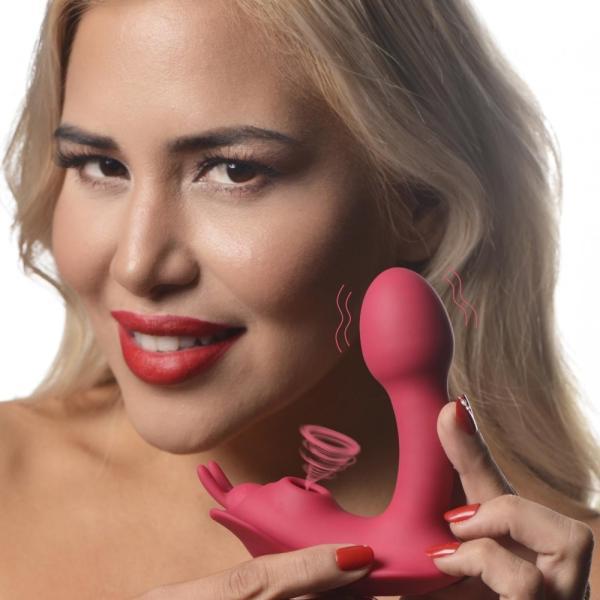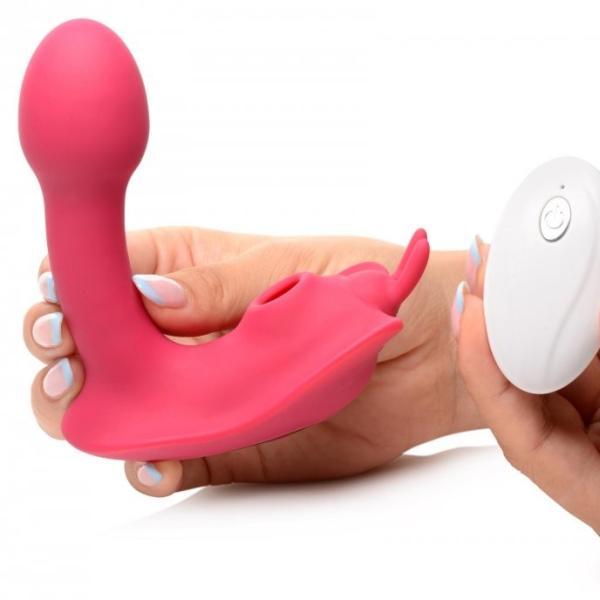 This vibrating and sucking clitoral stimulation toy will leave you with butterflies! Feel your heart flutter in excitement as you enjoy 10 sucking modes from the air stimulation technology gently teasing your clitoris. Insert the flexible shaft and feel the round tip press against your G-spot. Choose between 3 speeds and 7 patterns of vibration that buzzes through the shaft to your G-spot and clitoris for dual stimulation!