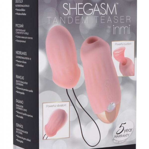 The powerful sucking clitoral vibe is programmed with 7 levels of suction, while the egg vibe is equipped with 3 speeds and 7 functions of buzzing. Use one Teaser at a time, or one in each hand for a highly personalized experience - focus on your clit with the clitoral sucker, and vibe your hole with the velvety buzzing egg. Turn on the turbo mode with the diamond button on the clitoral sucker to increase the intensity of both teasers at the same time! Perfect for dialing up your pleasure for a more intense climax.