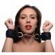 Make your next bondage session more secure and comfortable with these durable Heavy Duty Cuffs! The inside of the cuffs are lined with neoprene, making it easier and more comfortable for extended use, and have a nylon velcro strap. One cuff has a spring loaded metal clip while the other cuff has a D-Ring. You can use the clip to connect one cuff to the other or you can use the D-Ring and clip separately and attach each to a different object! Explore the many and endless possibilities of bondage with the Marquis Wristlets!